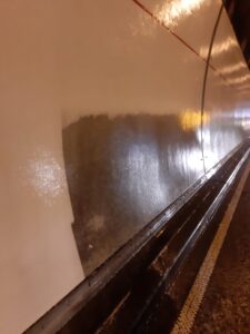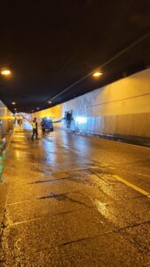 Unsere Aufgabe ist es, Schmutz, Ruß und Ablagerungen von den Tunnelwänden zu entfernen. Das verbessert nicht nur das Erscheinungsbild – eine saubere Oberfläche reflektiert mehr Licht, wodurch weniger Beleuchtung notwendig ist. Das spart Energie und sorgt gleichzeitig für bessere Sicht und mehr Sicherheit für alle, die den Tunnel passieren.